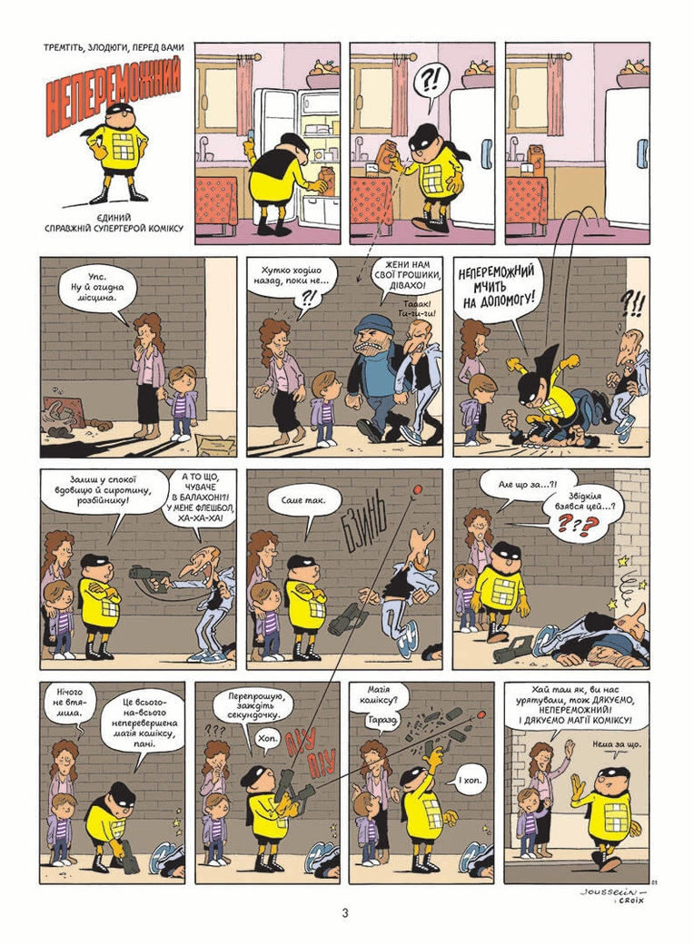 Тремтіть, злодюги, перед вами Непереможний! Цей герой витягає з халепи вдовицю й сиротину, рятує песиків і котиків, відстоює суспільні інтереси мешканців, визволяє дітей та й загалом усе місто! У масці, як усі вартові закону, у плащі, як усі вартові закону, він задає перцю з маком навіженому вченому й усім лихим жартівникам, при цьому ніколи не забуває купити хліба своїй бабусі. Так учинив би будь-який гідний герой. Однак Непереможний — не просто непереможний: завдяки суперсилі він єдиний справжній супергерой!